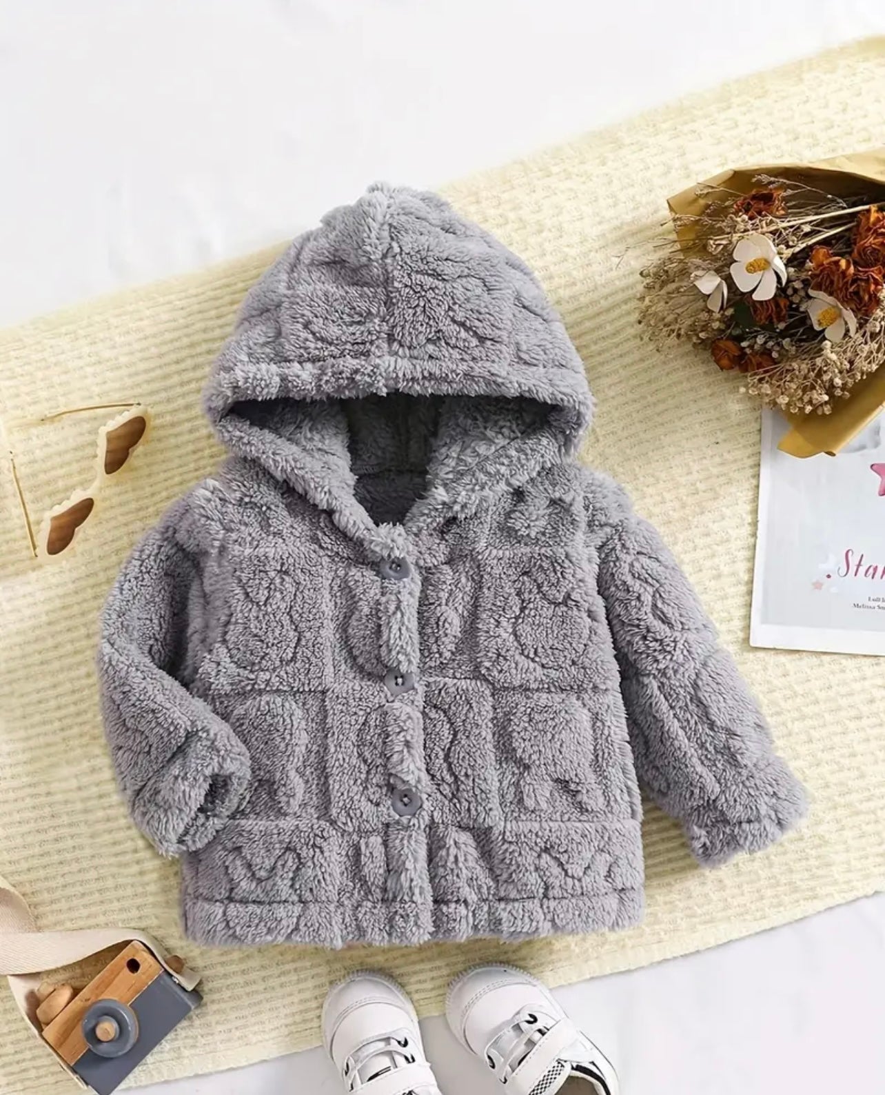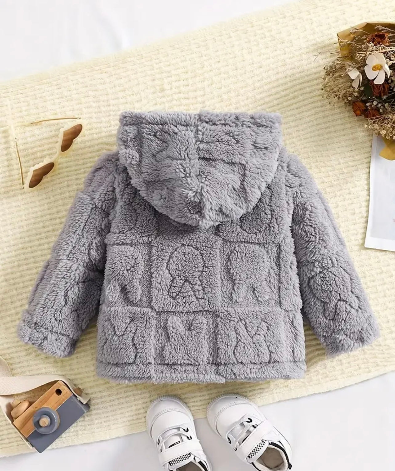 Esta chamarra gris afelpada con conejitos es perfecta para mantener a tu pequeño abrigado y cómodo en los días fríos.