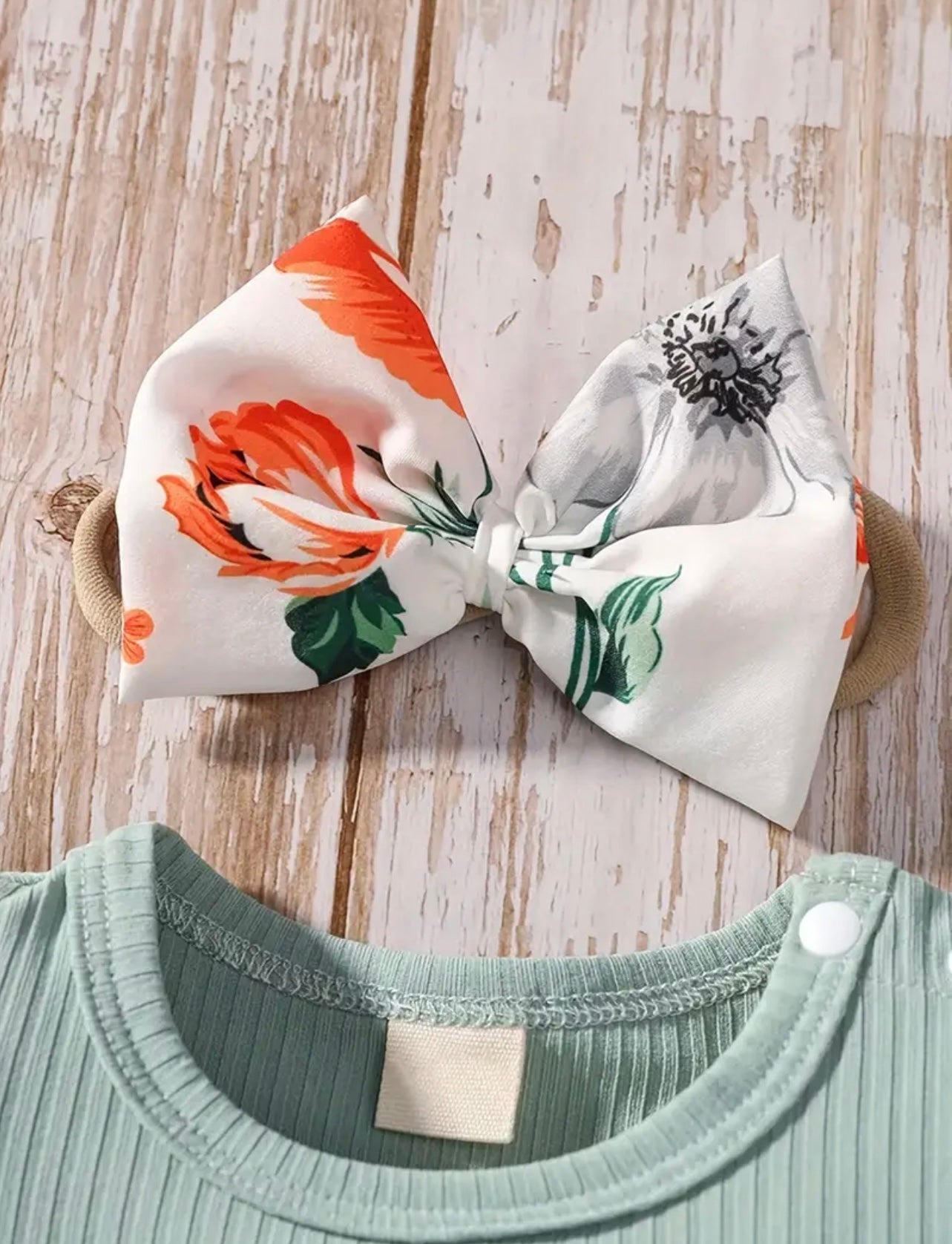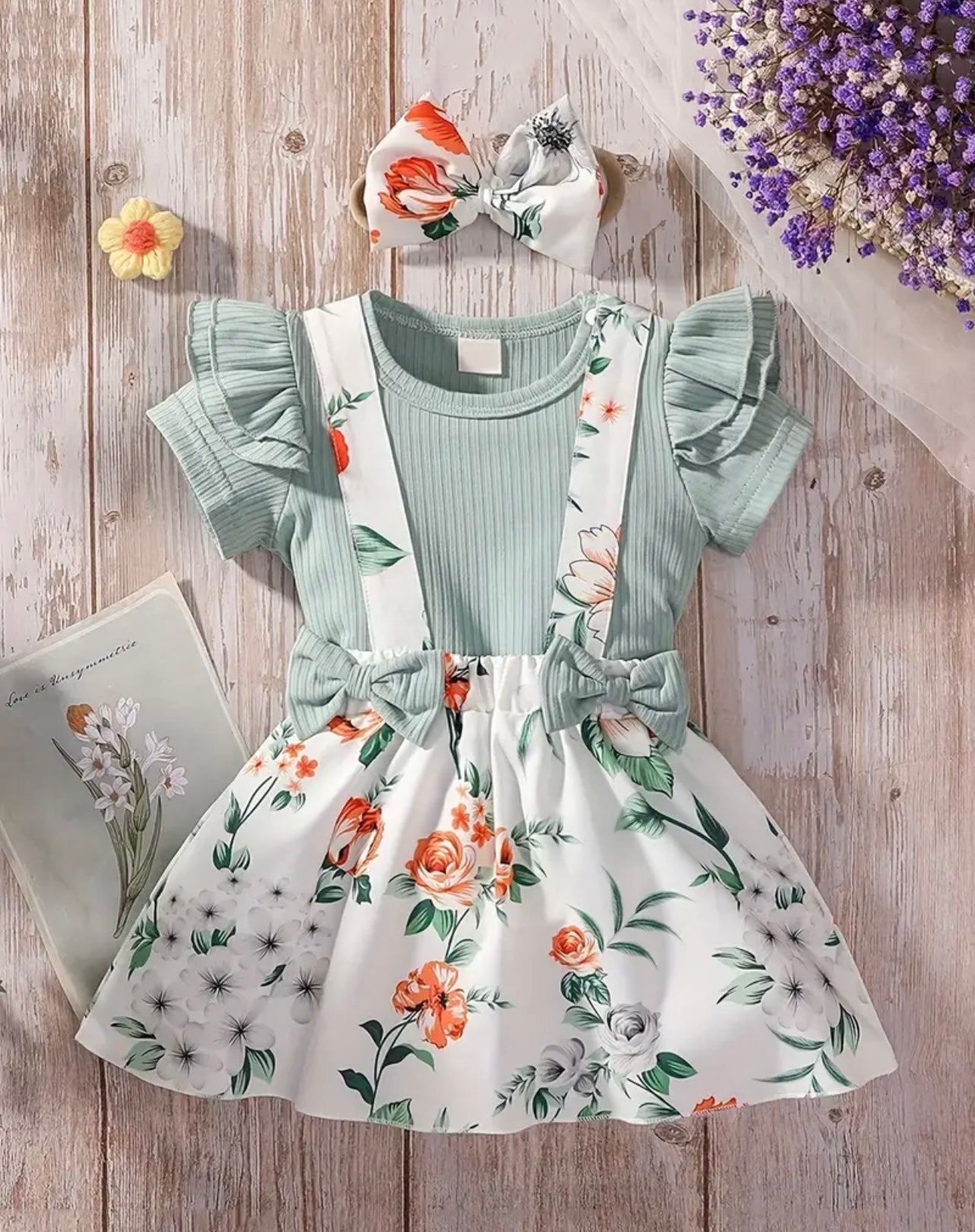 Incluye una faldita de fondo blanco con flores en tonos naranjas y un par de moñitos en los tirantes que le dan un toque super especial y un body con olanes en tono menta.