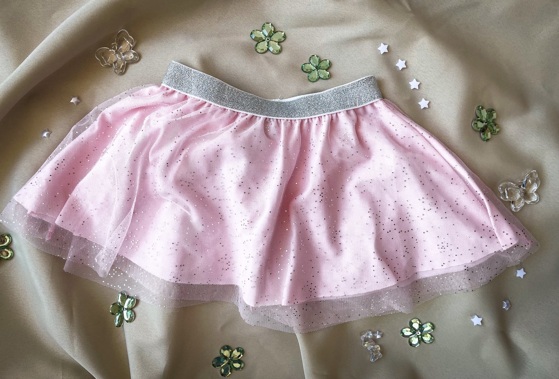 Faldita con fondo rosa, tul transparente y muchos brillitos.