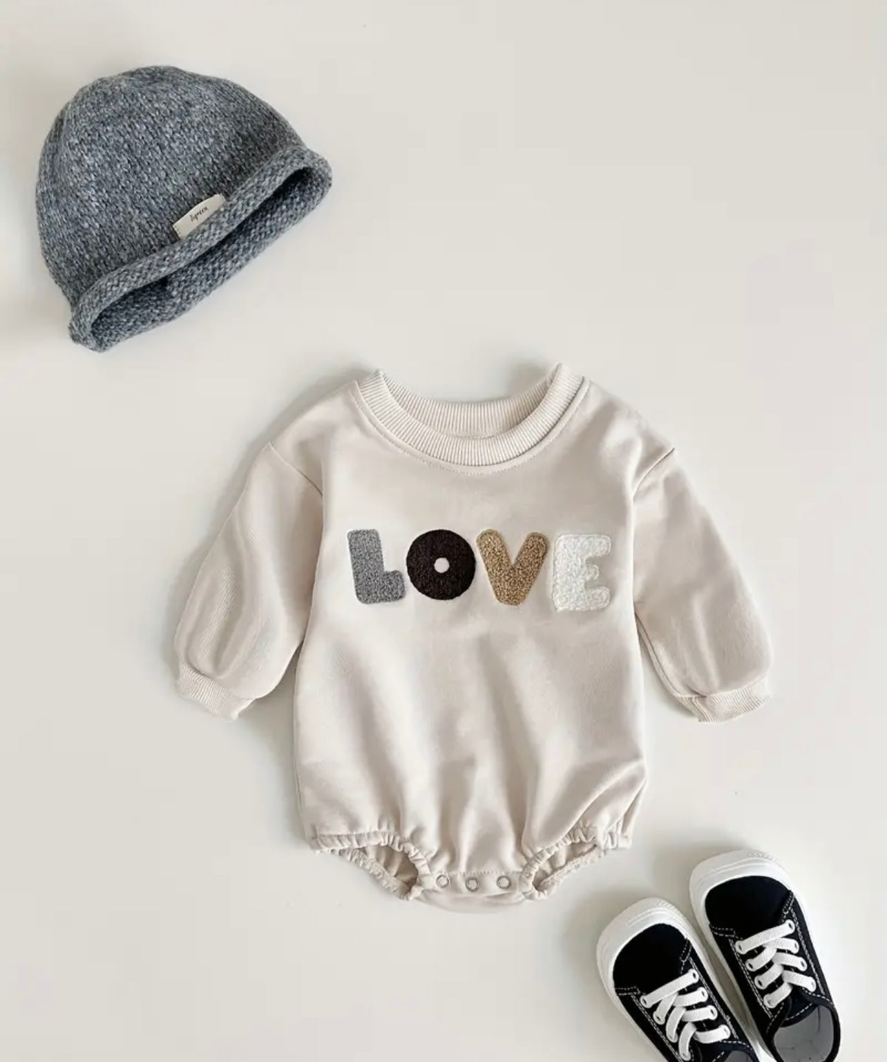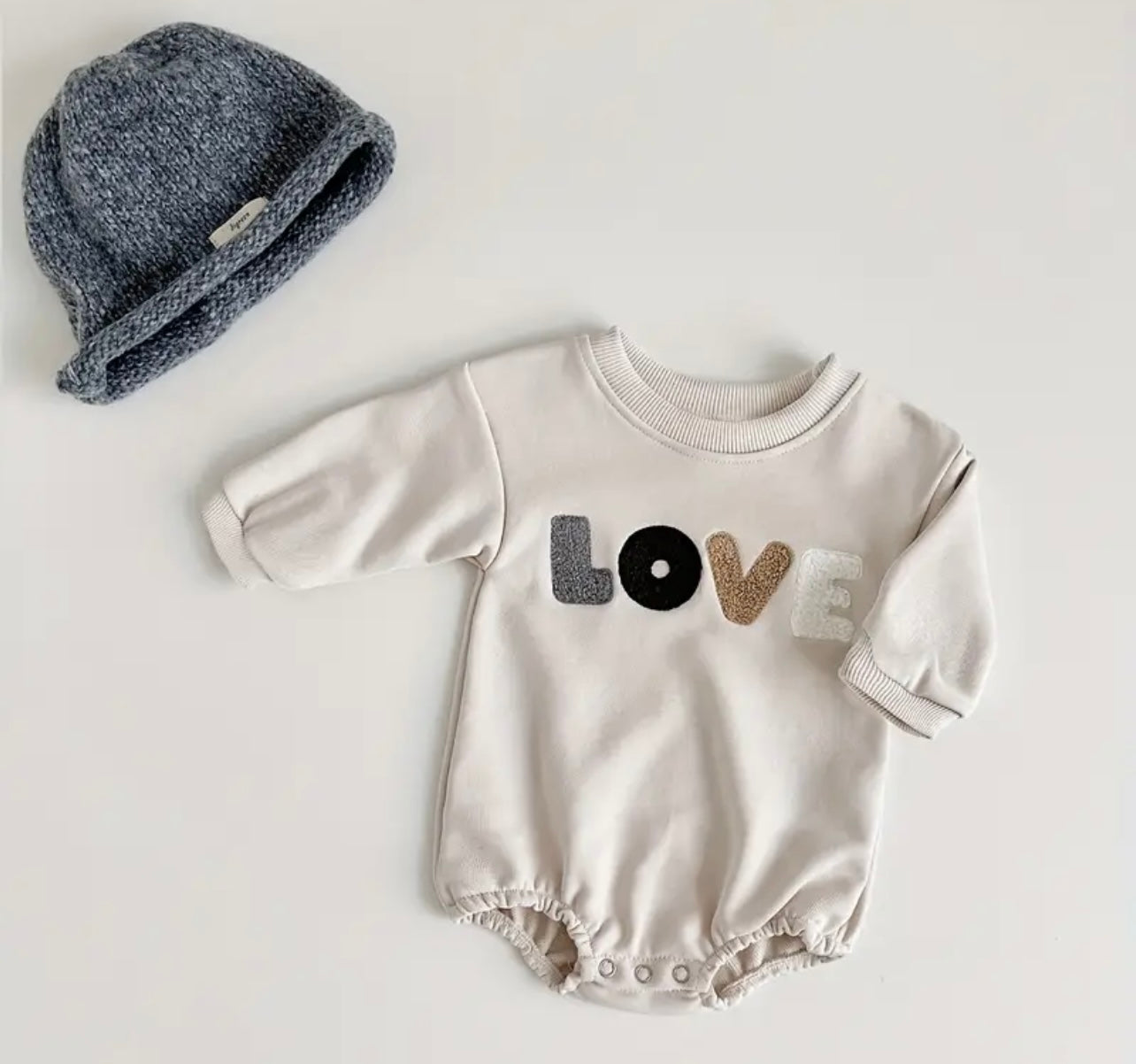 Ranita de manga larga en tono claro con estampado "LOVE" en relieve, de lo mas lindo que tenemos para los recién nacidos!