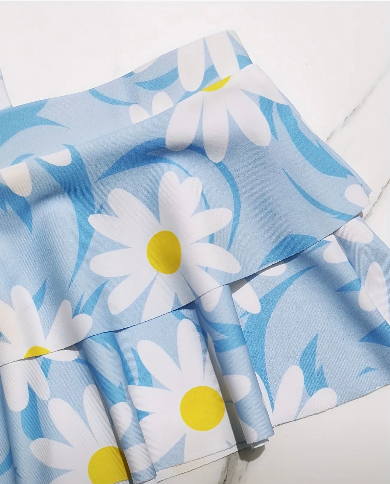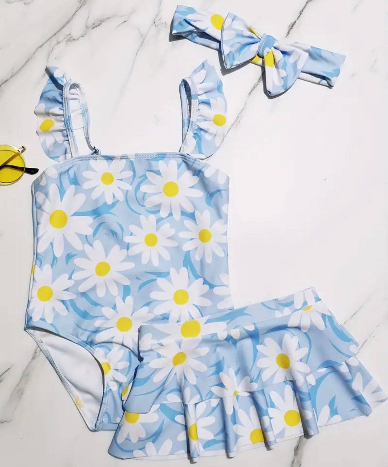 Incluye traje de baño, faldita a juego y banda para la cabeza.