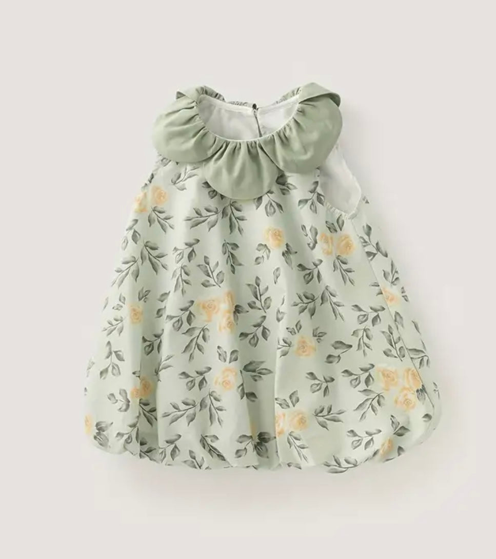 Hermoso vestido bombacho, en tono menta, con flores amarillas.