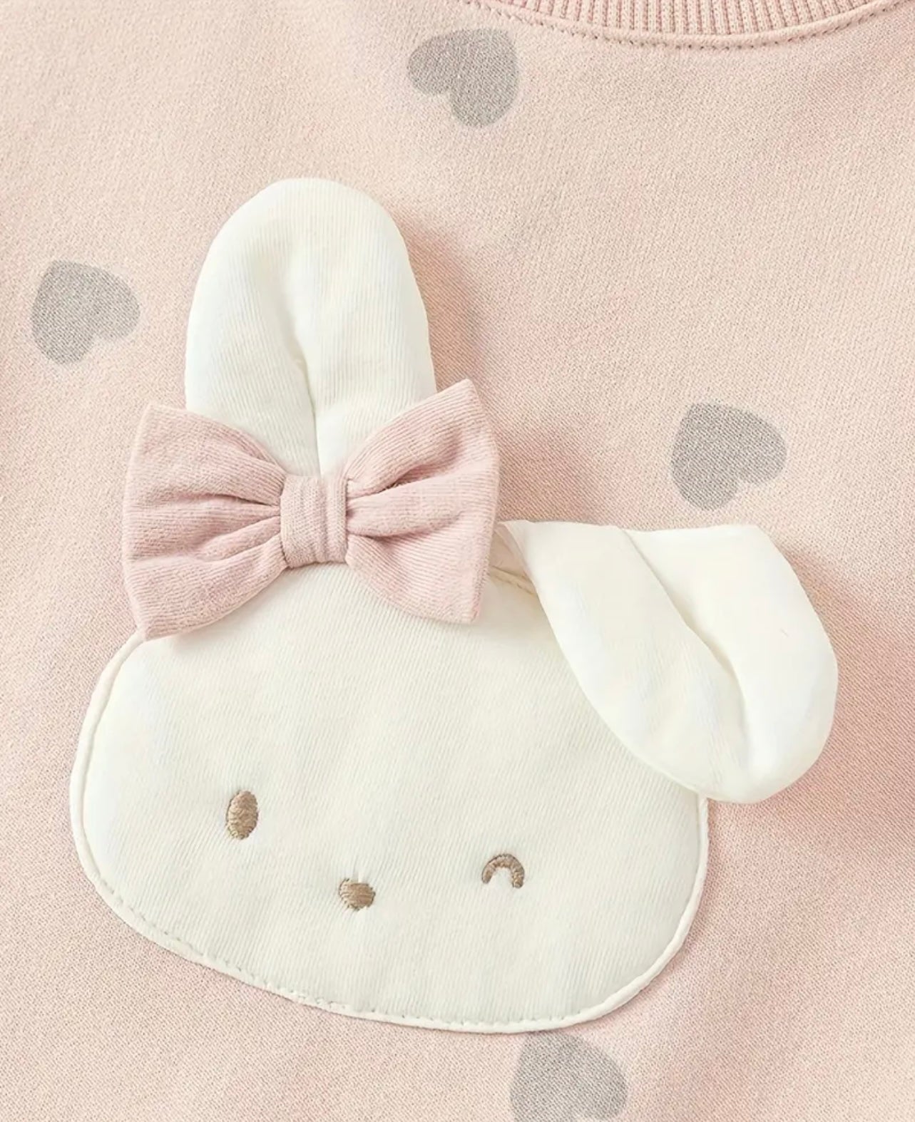 Vestido de manga larga en tono rosa con corazones grises y un pequeño conejito al centro, la parte baja es de tul en tono gris es muy suave y dulce